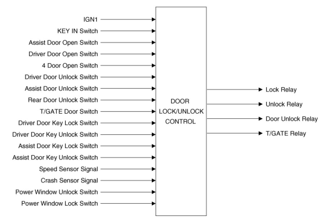(4) Perform Unlock Relay output for 1s in 0.5s when the condition becomes to be KEY IN = ON & Assist Door Open Switch =OPEN & Assist Door Unlock Switch = LOCK.