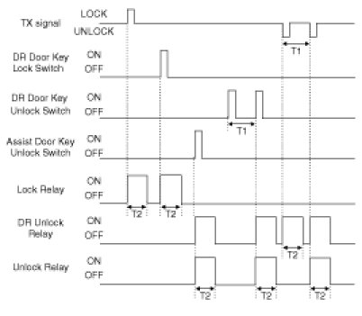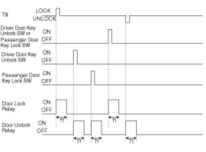 (3) Turn Driver Unlock Relay output ON during T2 when receiving TX UNLOCK signal. However, turn Driver Unlock Relay, Unlock Relay (Central Unlock) output during T2 if TX UNLOCK is received within T1.