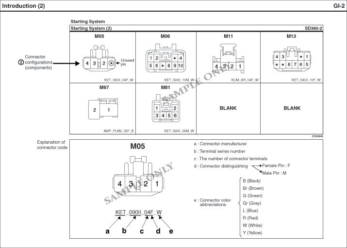 - It shows the front of the connector on the harness side when not to the harness connector. The terminal number on each connector can be obtained by following the pattern used in (5) connector view and numbering order. Unused terminals are marked with an asterisk (*).