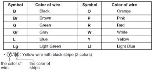 The following abbreviations are used to identify wire colors in the circuit schematics.