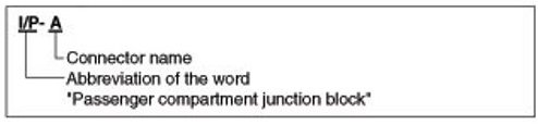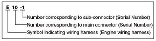 A Connector identification symbol consists of a wiring harness location classification symbol corresponding to a wiring harness location and number corresponding to the connector.