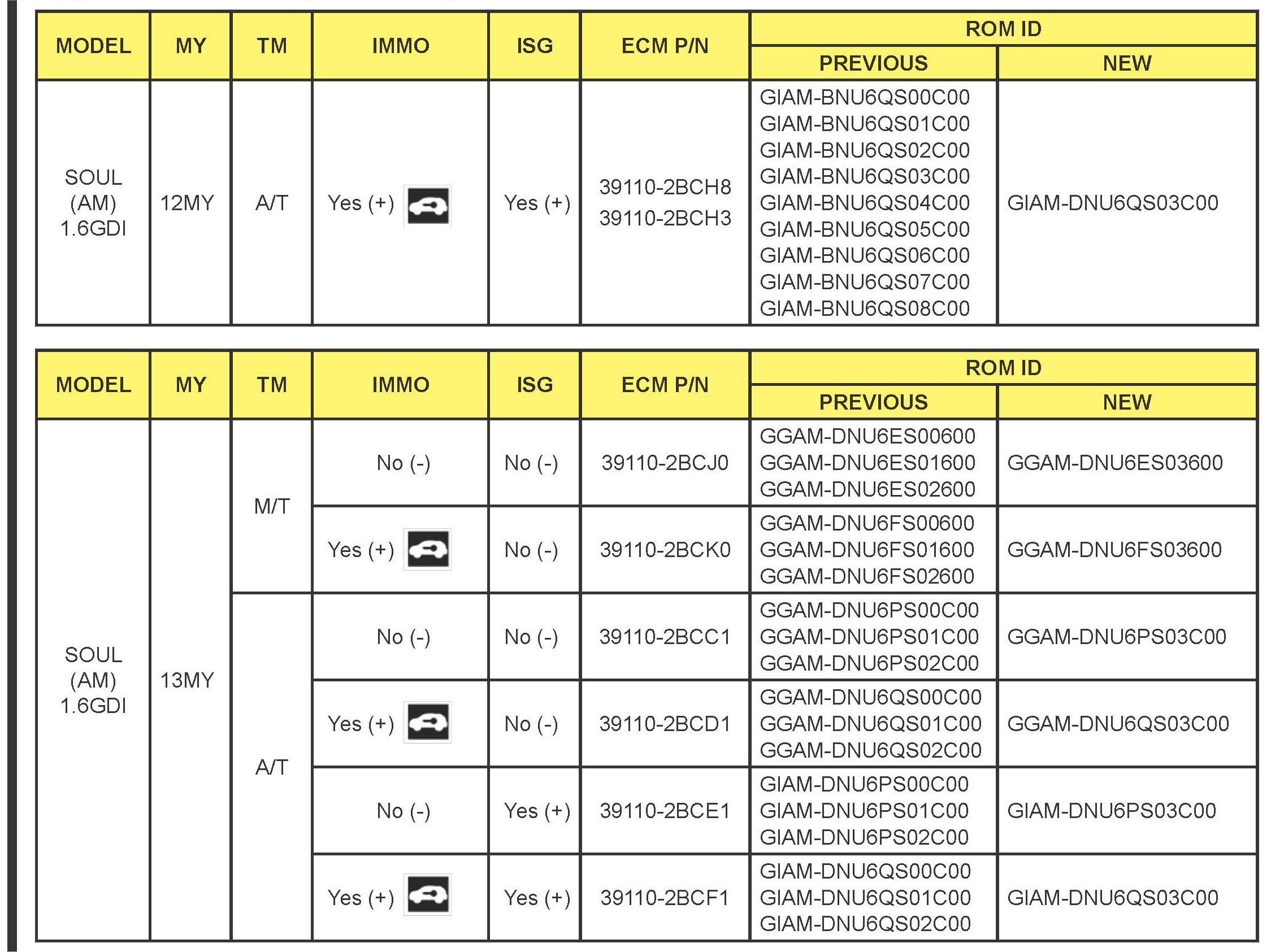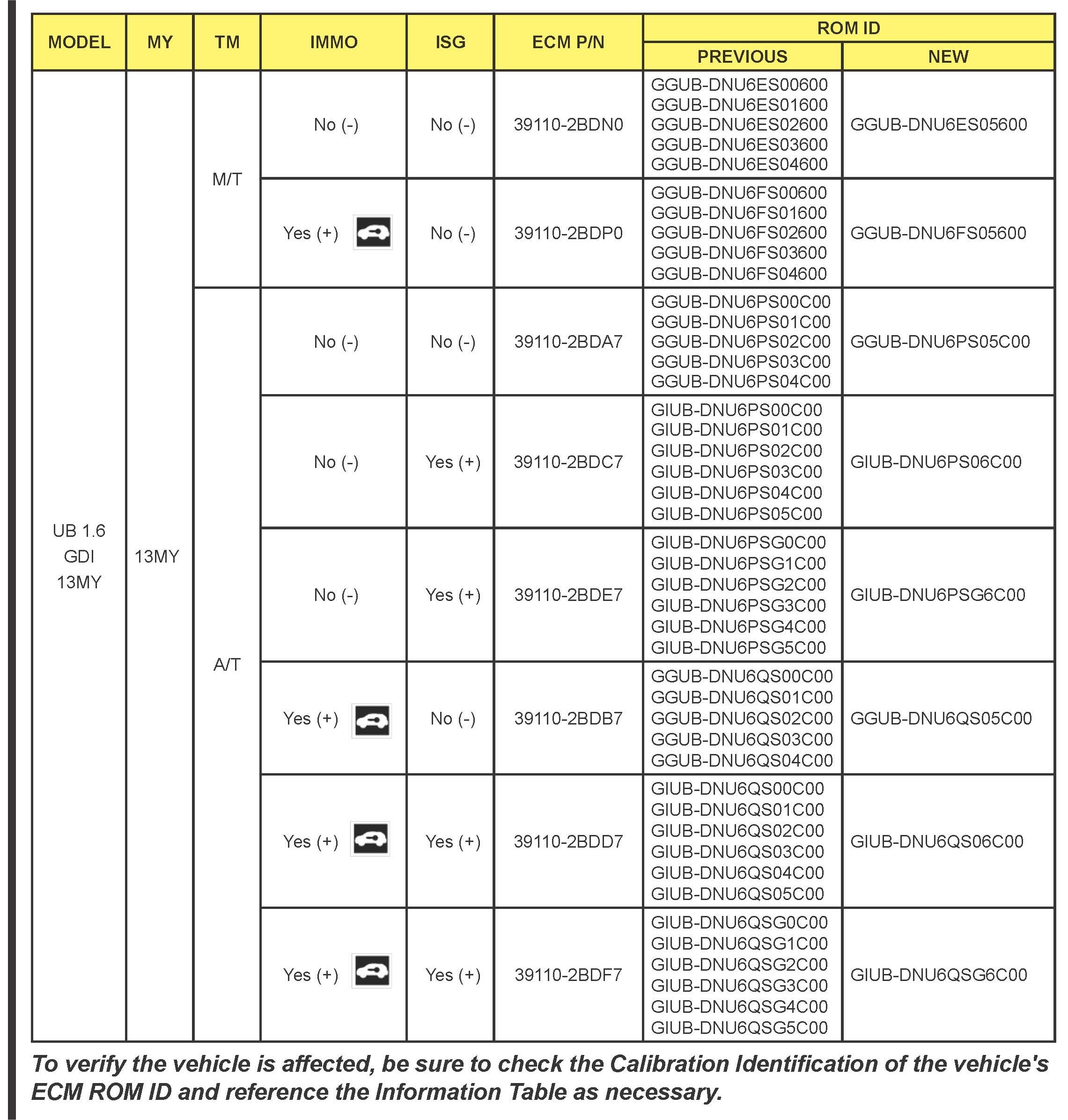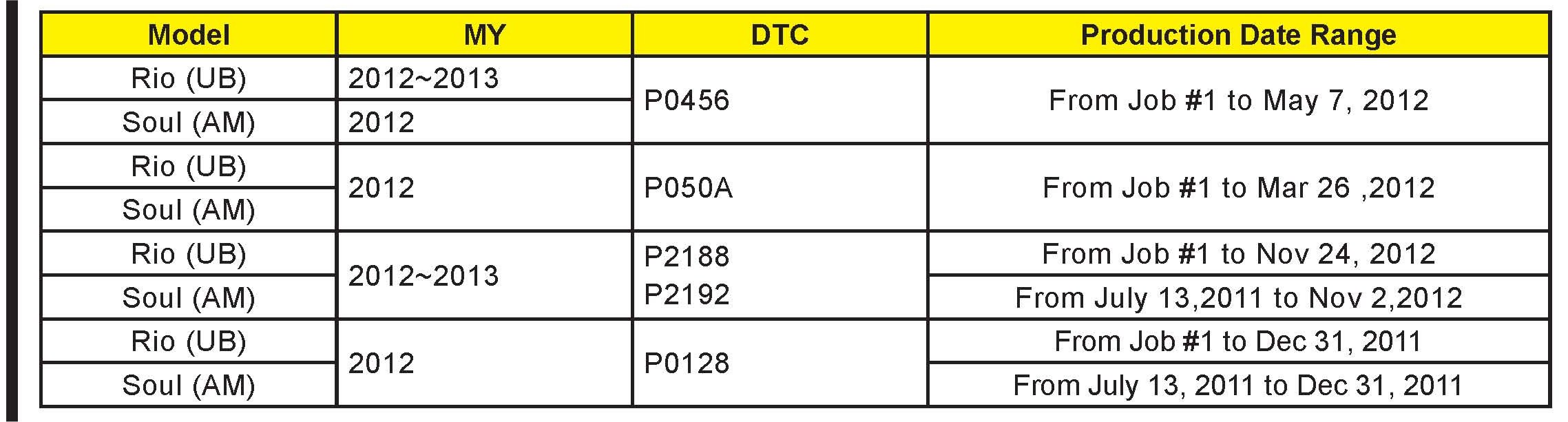 *This bulletin provides information rested to the ECM software upgrade for some 2012 - 2013MY Rio (UB) and some 2012-2013 Soul (AM) vehicles which may experience a malfunction indicator amp (MIL) illuminated with the Electronic Control Module (ECM) system rested DTCs; P0456, P050A, P2188, P2192, P0128. To correct this condition the ECM should be reprogrammed using the GDS download as described in this bulletin Before performing this procedure, verify the VIN falls within the production ranges by consulting the table on page 10 For confirmation that the atest reflash has been done to a vehicle you are working on verify ROM ID using the tables in this TSB.*