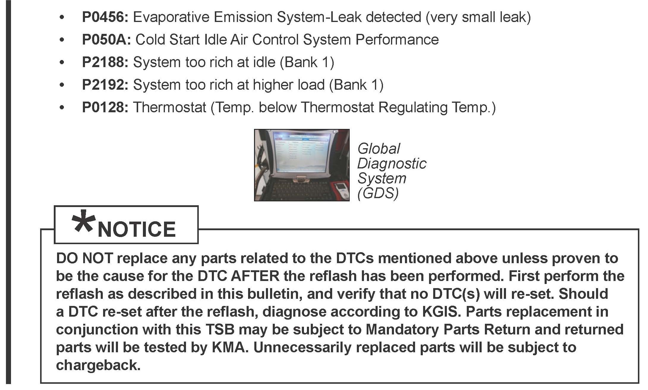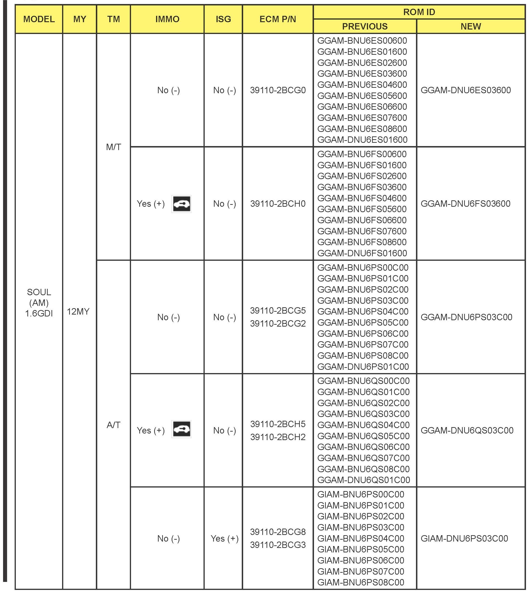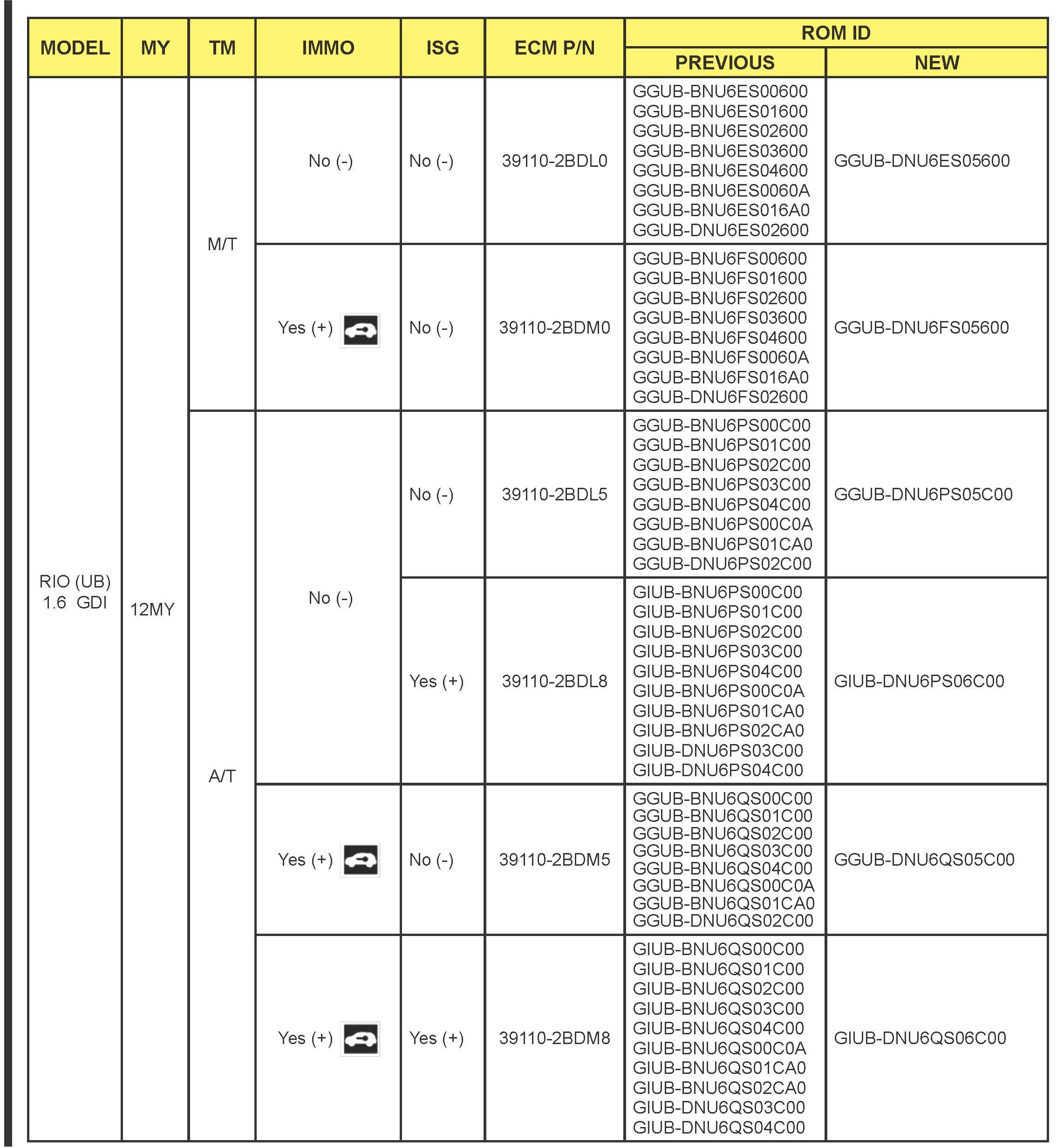 *This bulletin provides information rested to the ECM software upgrade for some 2012 - 2013MY Rio (UB) and some 2012-2013 Soul (AM) vehicles which may experience a malfunction indicator amp (MIL) illuminated with the Electronic Control Module (ECM) system rested DTCs; P0456, P050A, P2188, P2192, P0128. To correct this condition the ECM should be reprogrammed using the GDS download as described in this bulletin Before performing this procedure, verify the VIN falls within the production ranges by consulting the table on page 10 For confirmation that the atest reflash has been done to a vehicle you are working on verify ROM ID using the tables in this TSB.*