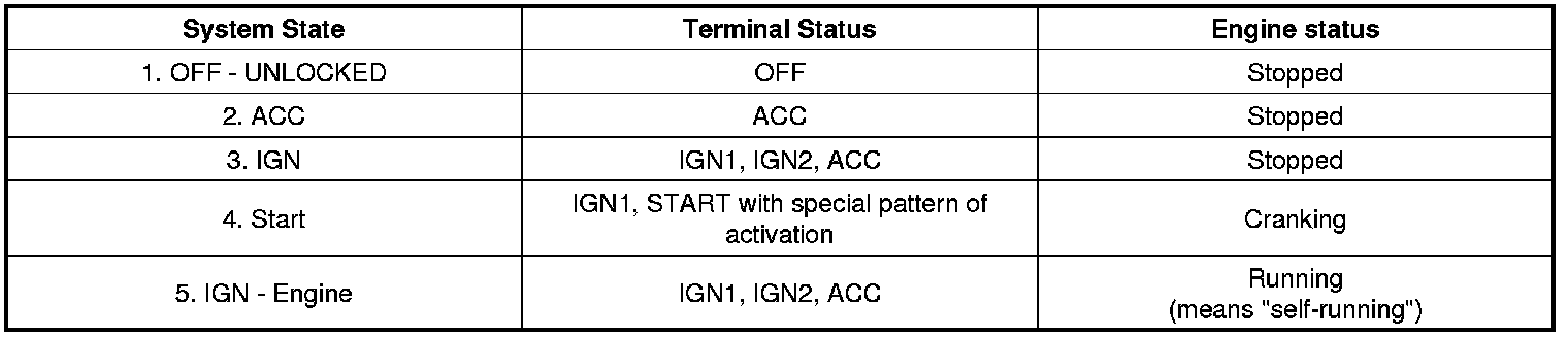 Referring to the terminals, the system states described in the table above are same as those one found in a system based on a mechanical ignition switch. The one of distinction with Mechanical-Ignition-Switch based system is that the BES system allows specific transition from [OFF] to [START] without going through [ACC] and [IGN] states.