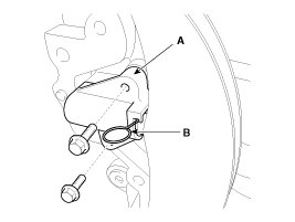 Install the timing chain auto tensioner (A) and remove the stopper pin (B).