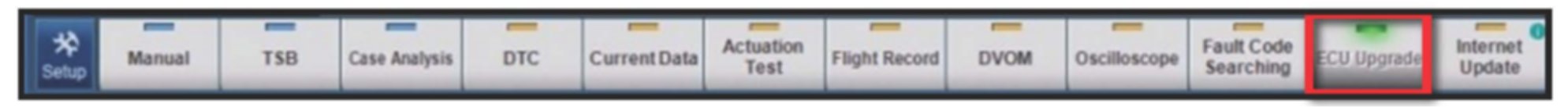 6. Once back at the GDS Main Screen, select ECU Upgrade from the bottom right-hand corner. Next select Auto Mode, and then Engine. Perform the ECM upgrade in accordance with normal GDS tool ECM upgrade procedures.