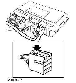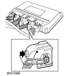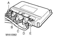 The E-box is a moulded black plastic case which houses the ECM and protects it from sources of contamination. The ECM itself is contained in a cast aluminium case. The ECM has 5 independent connectors totalling 134 pins, of which up to 79 are used, dependent on market variations. The ECM and connectors can be accessed by positioning the cruise control pneumatic actuator and pump assembly aside, lifting the two plastic clips at the top of the e-box and pulling the E-box lid upwards and out. The ECM is held in position in the lid of the box by two plastic brackets. The ECM connectors have to be disengaged sequentially to release them from the unit. Similarly, when the connectors are reconnected to the ECM, the correct sequence must be observed.