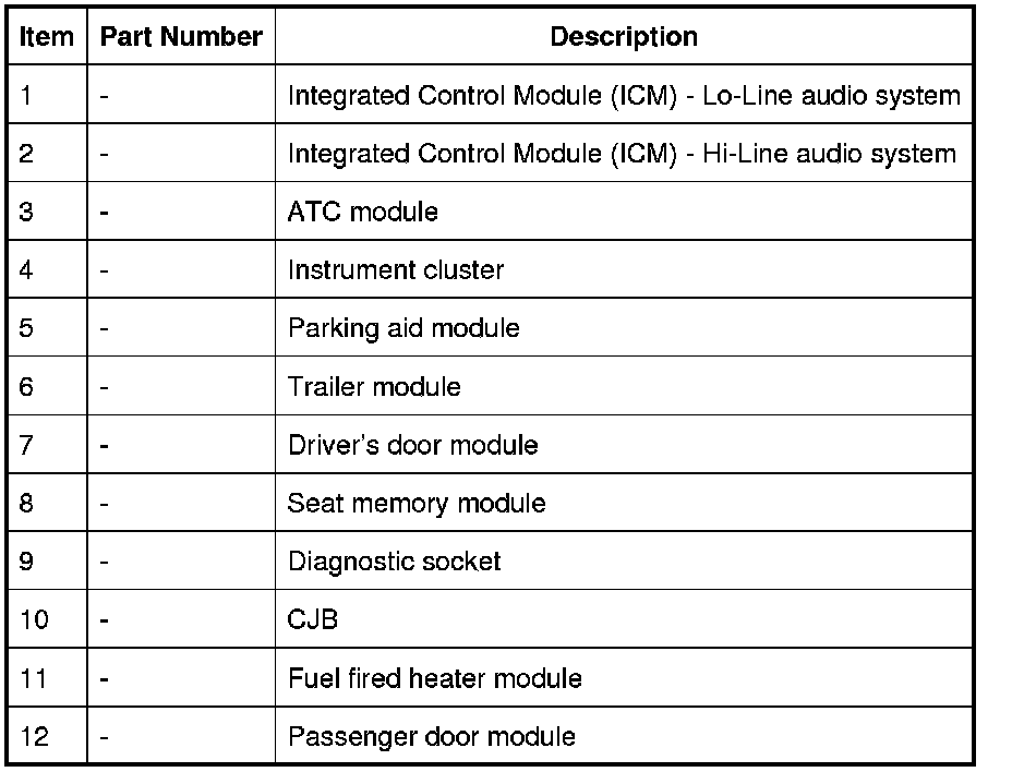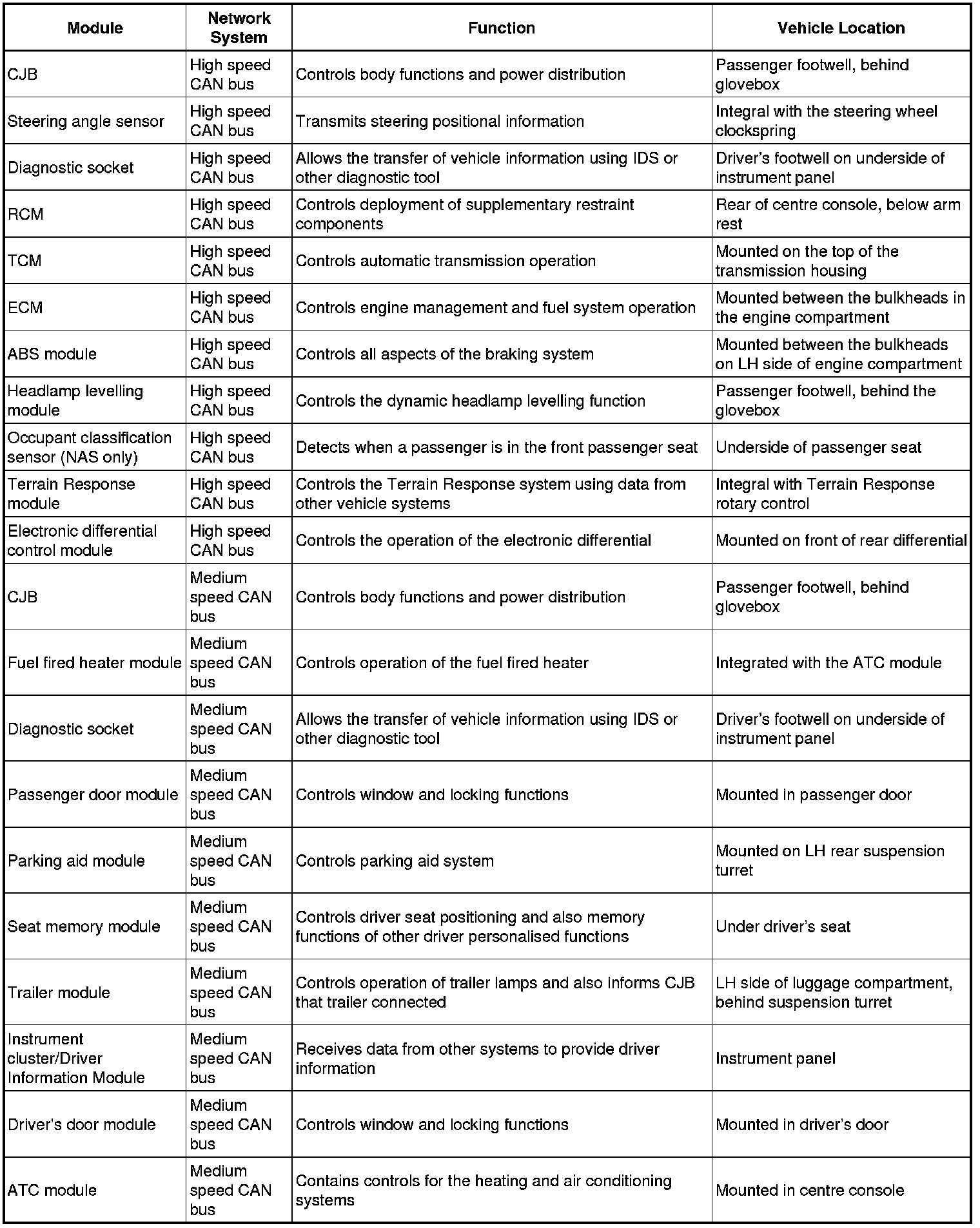 The following table shows each vehicle control module, the network system to which it is connected, its function and location in the vehicle.