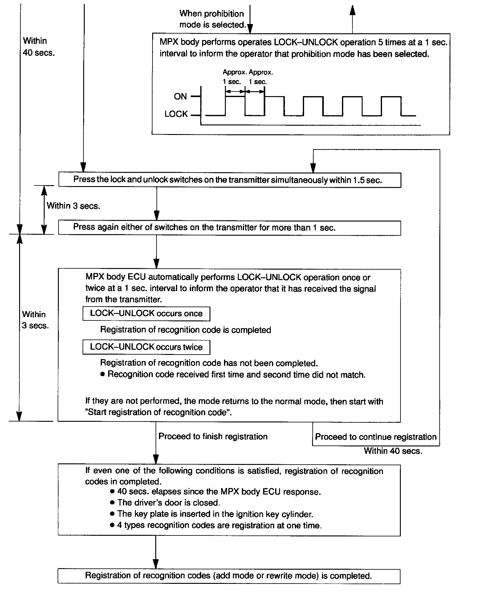 - The add mode is used to retain codes already registered while you register new recognition codes. This mode is used when adding a transmitter. However, if the number of registered codes exceeds 4 codes, previously registered codes are correspondingly erased in order, starting from the first registered code.