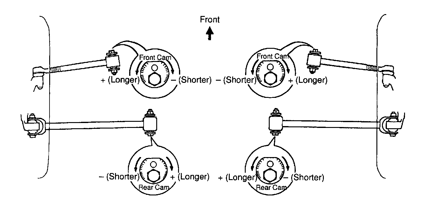 d. Adjust camber and toe-in by turning the front and/or rear cams.