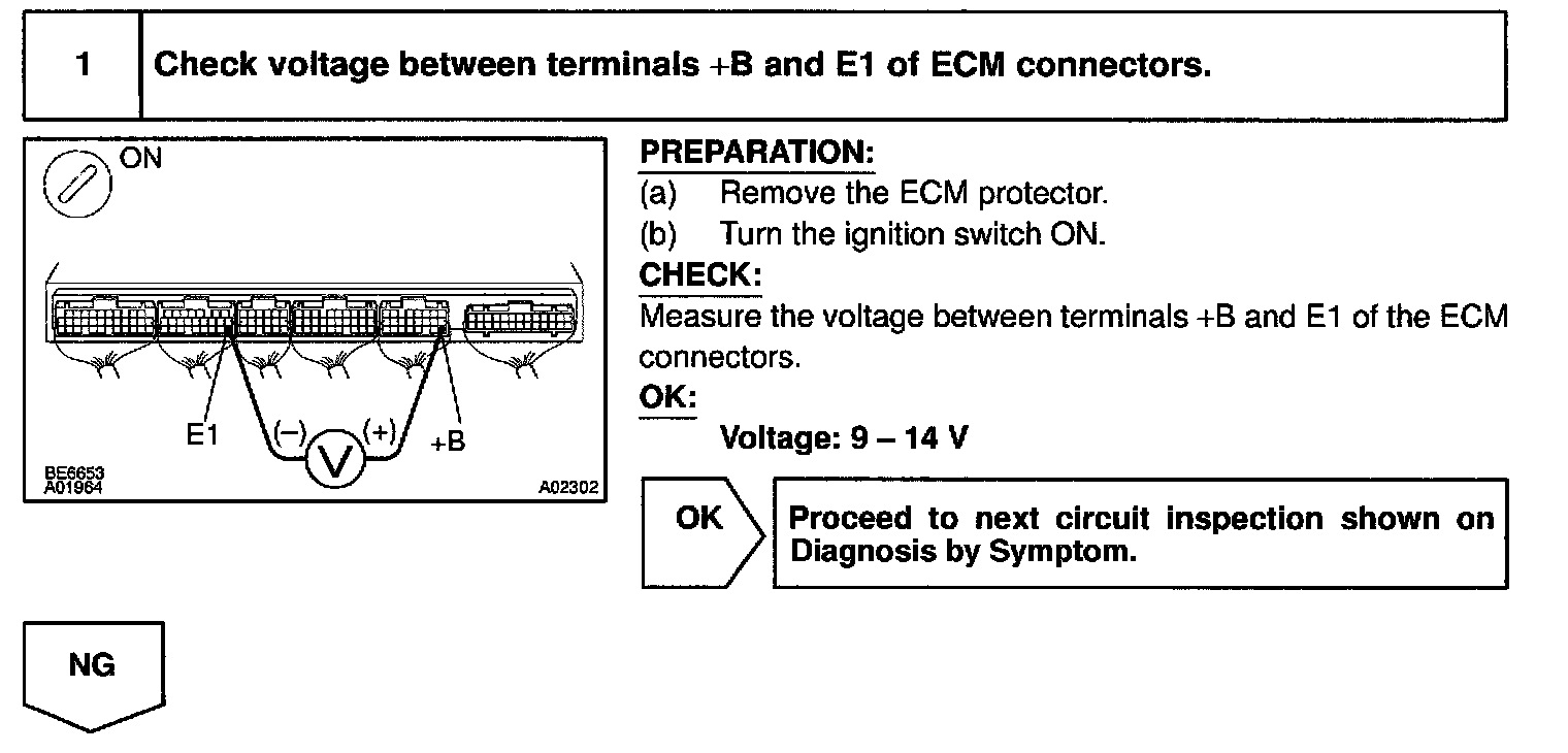 This signal causes current to flow to the coil, closing the contacts of the EFI main relay and supplying power to terminal +B of the ECM.