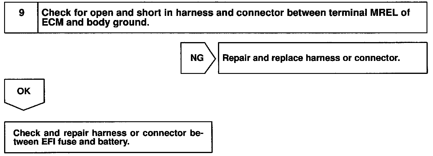 CIRCUIT DESCRIPTIONWhen the ignition switch is turned ON, battery positive voltage is applied to terminal IGSW of the ECM and the EFI main relay control circuit in the ECM sends a signal to terminal MREL of the ECM switching on the EFI main relay.