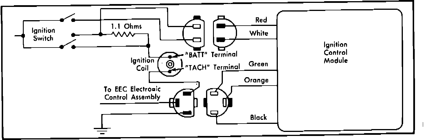The Ignition Module shuts off the primary circuit each time it receives a pulse from the EEC III Microprocessor Fig. 2. A timing circuit in the ignition module turns the primary current back on after a short period of time. High voltage is created each time the magnetic field is built up and collapsed. The red ignition module wire provides operating voltage for the module's electronic components in the Run mode. The white module wire and start bypass provide increased voltage for the module and coil during Start mode.