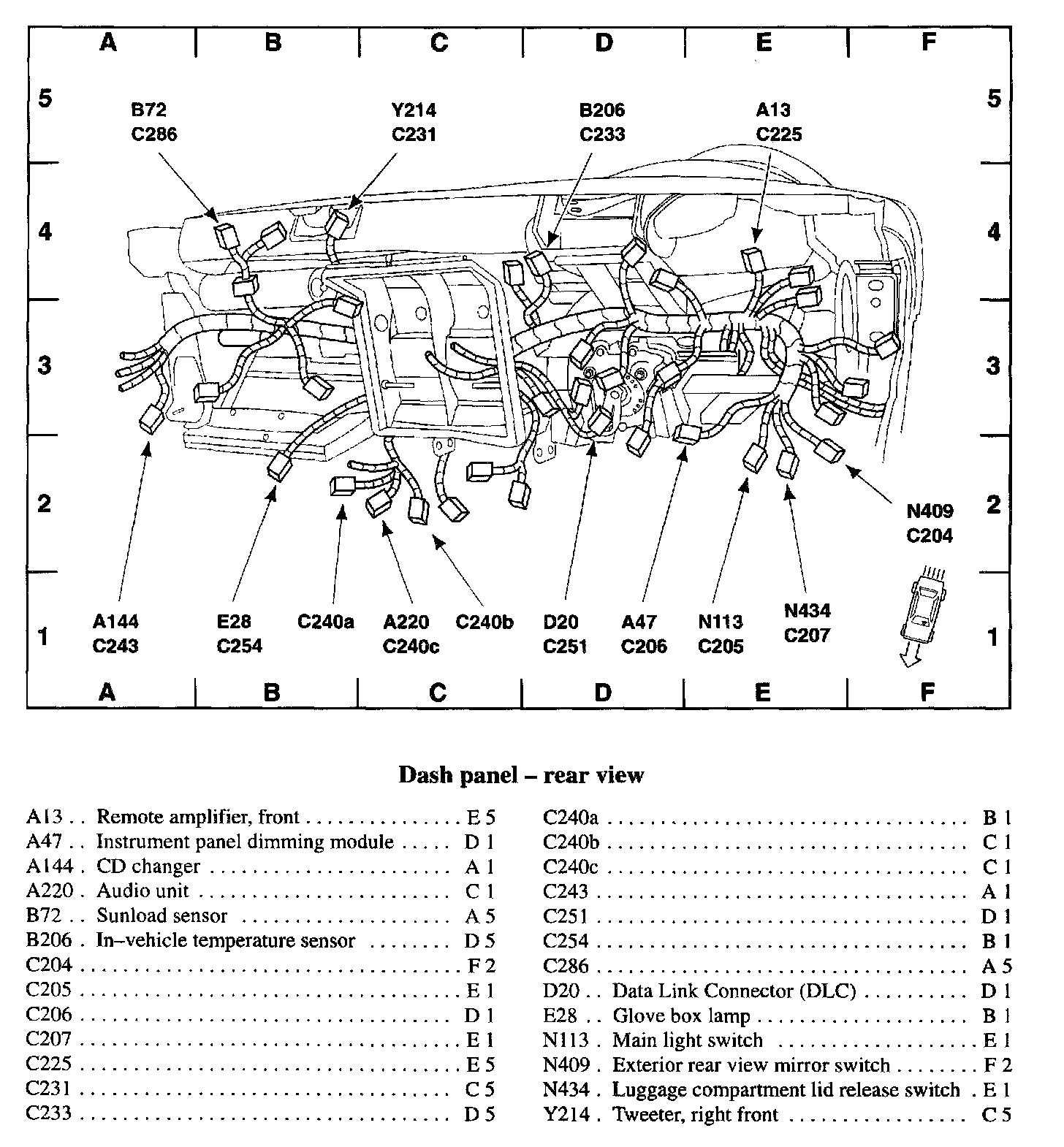 Data Link Connector is located a D20. The image is the rear view of the dash panel. Steering wheel is in the upper right of the image.