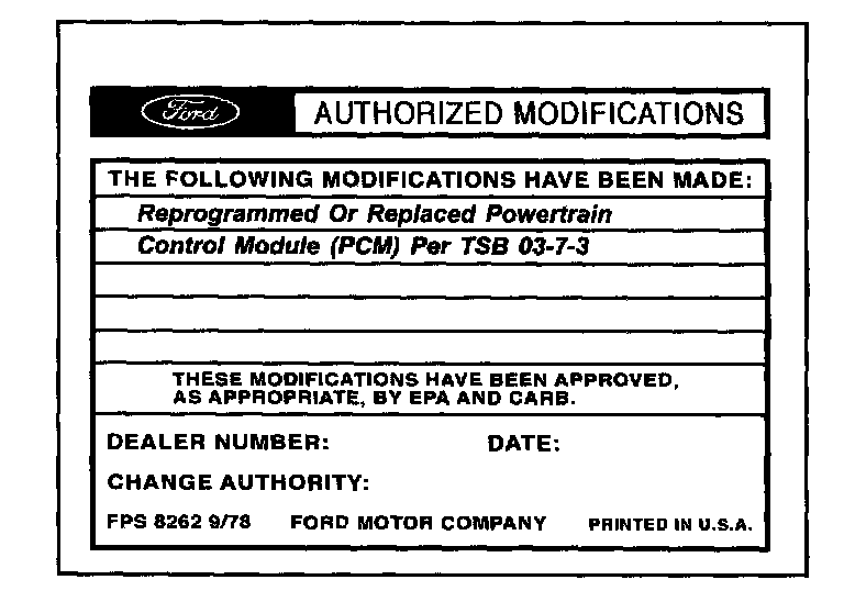 Obtain an Authorized Modifications Decal (FPS 8262 - obtainable through DOES II, 25/pkg) and list the date, dealer number, and summary of modifications performed. Select a prominent place adjacent to the Vehicle Emission Control Information Decal suitable for installing the Authorized Modifications Decal. Clean the area, install the decal, and cover it with a clear plastic decal shield.