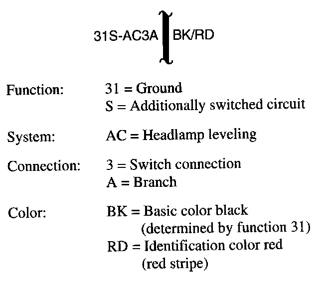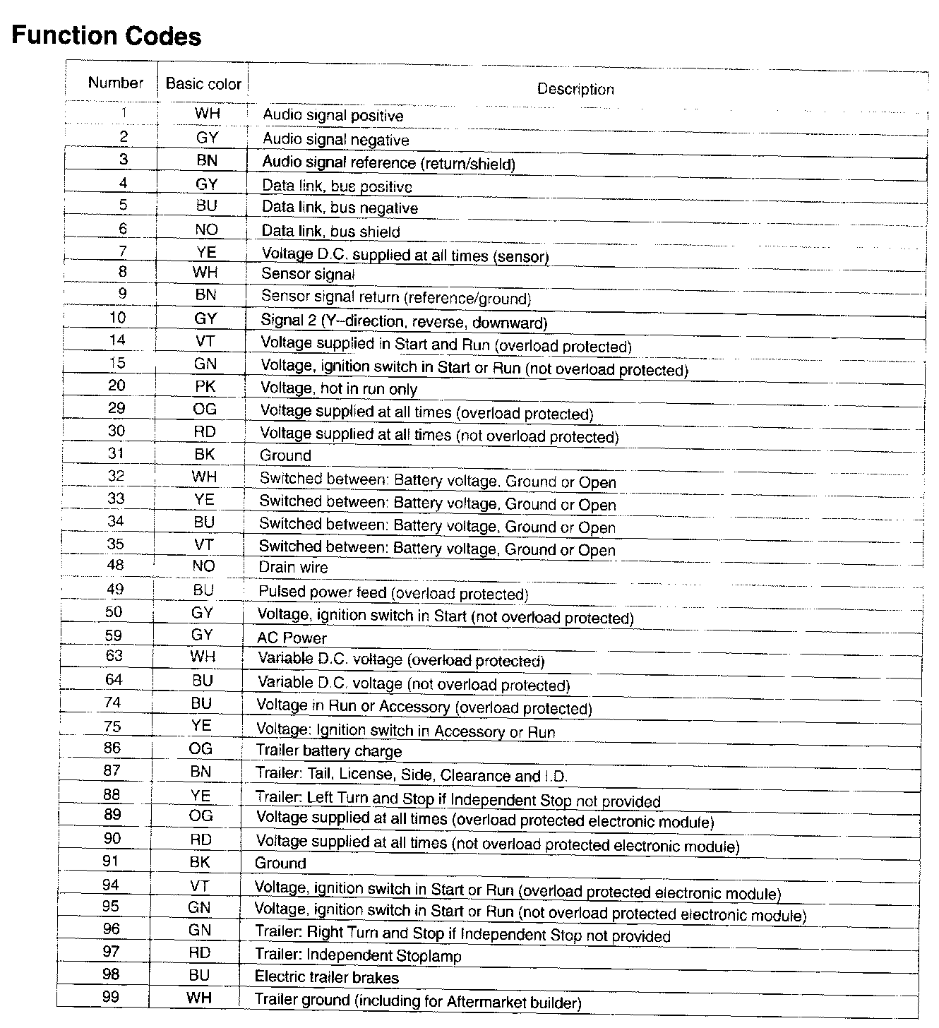 Each function code has a specific basic color associated with it, which can also be seen in the chart of function codes on the next diagram. The identification color is a colored stripe used to differentiate several wires with the same function within one component connector.
