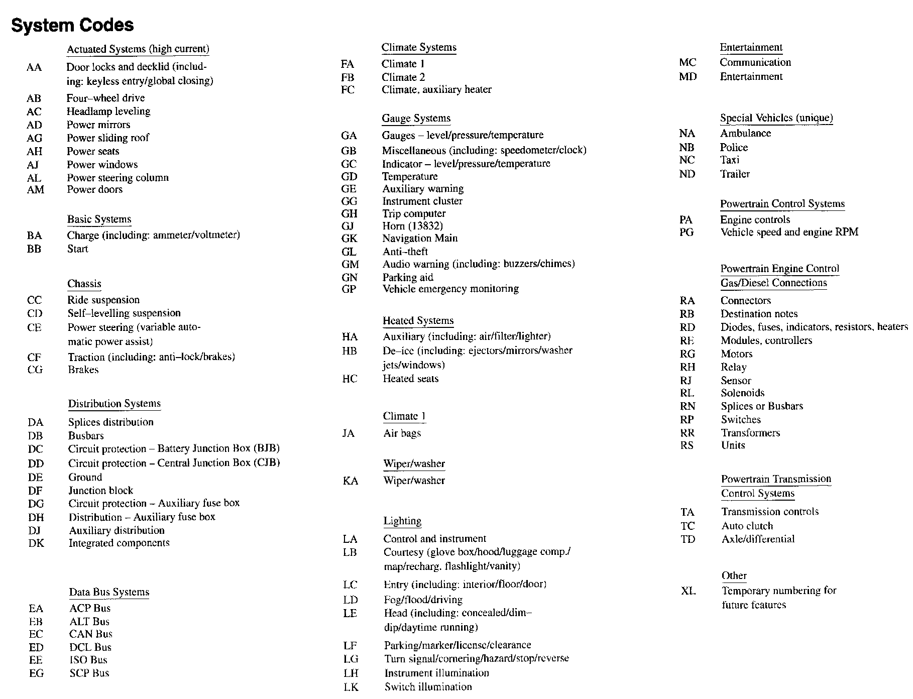 Systems are related to subsets of the vehicle circuitry. A complete list of the system codes are shown in System Codes Diagram.