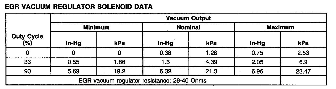 The EGR vacuum regulator solenoid is an electromagnetic device used to regulate the vacuum supply to the EGR valve. The solenoid contains a coil which magnetically controls the position of a disc to regulate the vacuum. As the duty cycle to the coil increases, the vacuum signal passed through the solenoid to the EGR valve also increases. Vacuum not directed to the EGR valve is vented through the solenoid vent to atmosphere. Note that at 0% duty cycle (no electrical signal applied), the EGR vacuum regulator solenoid allows some vacuum to pass, but not enough to open the EGR valve.