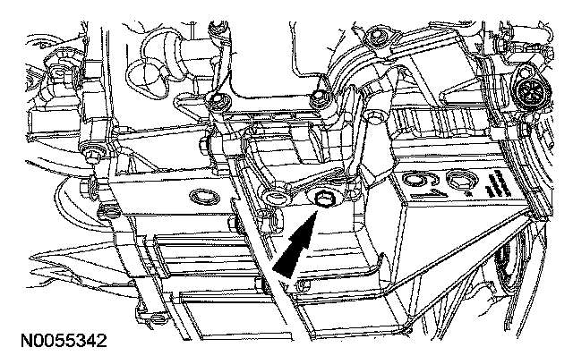 13. Position the transmission fluid cooler thermal bypass valve and transmission fluid cooler tube assembly in place and install the 2 nuts.