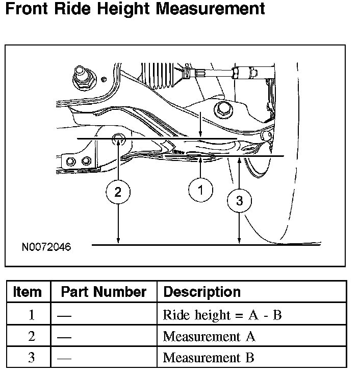 Front Ride Height MeasurementNOTE: Make sure that the vehicle is positioned on a flat, level surface and the tires are inflated to the correct pressure. Vehicle should have a full tank of fuel.