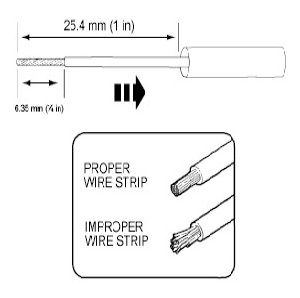 2. Strip 6.35mm (1/4 in) of insulation from each wire end, taking care not to nick or cut wire strands.