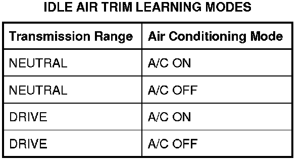 Once the KAM has been reset, the engine must idle for 15 minutes (actual time varies between strategies) to learn new idle air trim values. Idle quality improves as the strategy adapts. Adaptation occurs in 4 separate modes as shown in the following table.