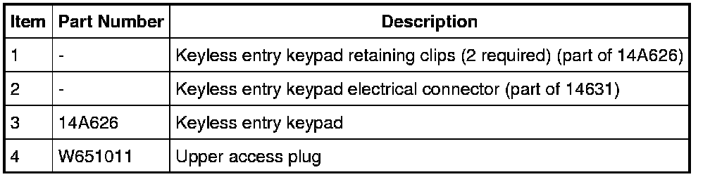 2. Using a suitable tool (such as a long, flat-blade screwdriver), through the upper access hole, release the rear keyless entry keypad retaining clip and position the keyless entry keypad aside.