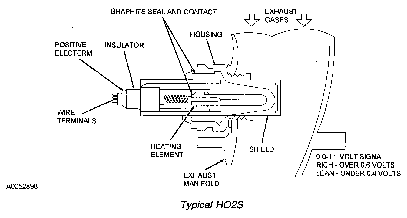 The HO2S detects the presence of oxygen in the exhaust and produces a variable voltage according to the amount of oxygen detected. A high concentration of oxygen (lean air/fuel ratio) in the exhaust produces a voltage signal less than 0.4 volt. A low concentration of oxygen (rich air/fuel ratio) produces a voltage signal greater than 0.6 volt. The HO2S provides feedback to the PCM indicating air/fuel ratio in order to achieve a near stoichiometric air/fuel ratio of 14.7:1 during closed loop engine operation. The HO2S generates a voltage between 0.0 and 1.1 volts.