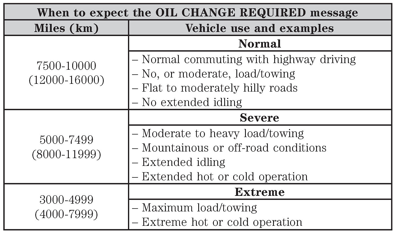 Your vehicle is equipped with an Intelligent Oil Life MonitorTM that determines when the engine oil should be changed based on how your vehicles is used. By using several important factors in its calculations, the monitor helps reduce the cost of owning your vehicle and reduce environmental waste at the same time. This means you won't have to remember to change the oil on a mileage-based schedule; the vehicle lets you know when an oil change is due by displaying ENGINE OIL CHANGE DUE or OIL CHANGE REQUIRED in the message center. The following table is intended to provide examples of vehicle use and its impact on engine oil change intervals; it is provided as a guideline only. Actual engine oil change intervals will depend on several factors and will generally decrease with severity of use.