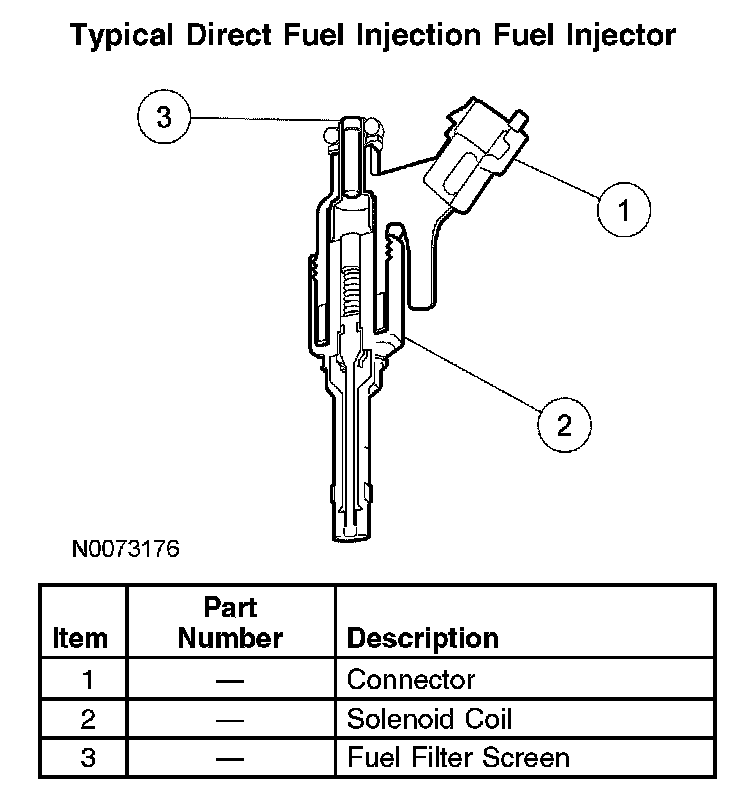 The gasoline direct fuel injection fuel injector delivers fuel directly into the cylinder under high pressure. Each injector is controlled by 2 circuits from the PCM.
