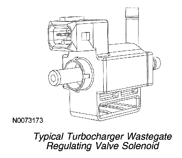 The TC wastegate regulating valve solenoid allows the PCM to indirectly control the turbocharger wastegates. The TC wastegate regulating valve solenoid controls the feedback pressure to a pneumatically powered wastegate diaphragm in order to control the boost pressure limit. When the compressor outlet pressure is allowed to increase, a pneumatically powered actuator opens each turbocharger wastegate and limits compressor outlet pressure.
