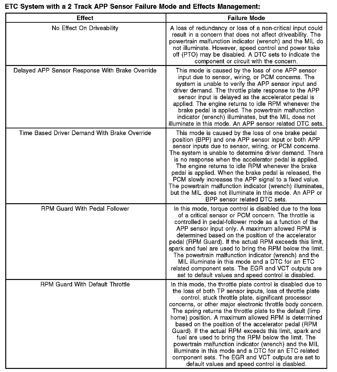 The ETC system illuminates a powertrain malfunction indicator (wrench) on the instrument cluster (IC) or instrument panel cluster (IPC) when a concern is present. Concerns are accompanied by diagnostic trouble codes (DTCs) and may also illuminate the malfunction indicator lamp (MIL).