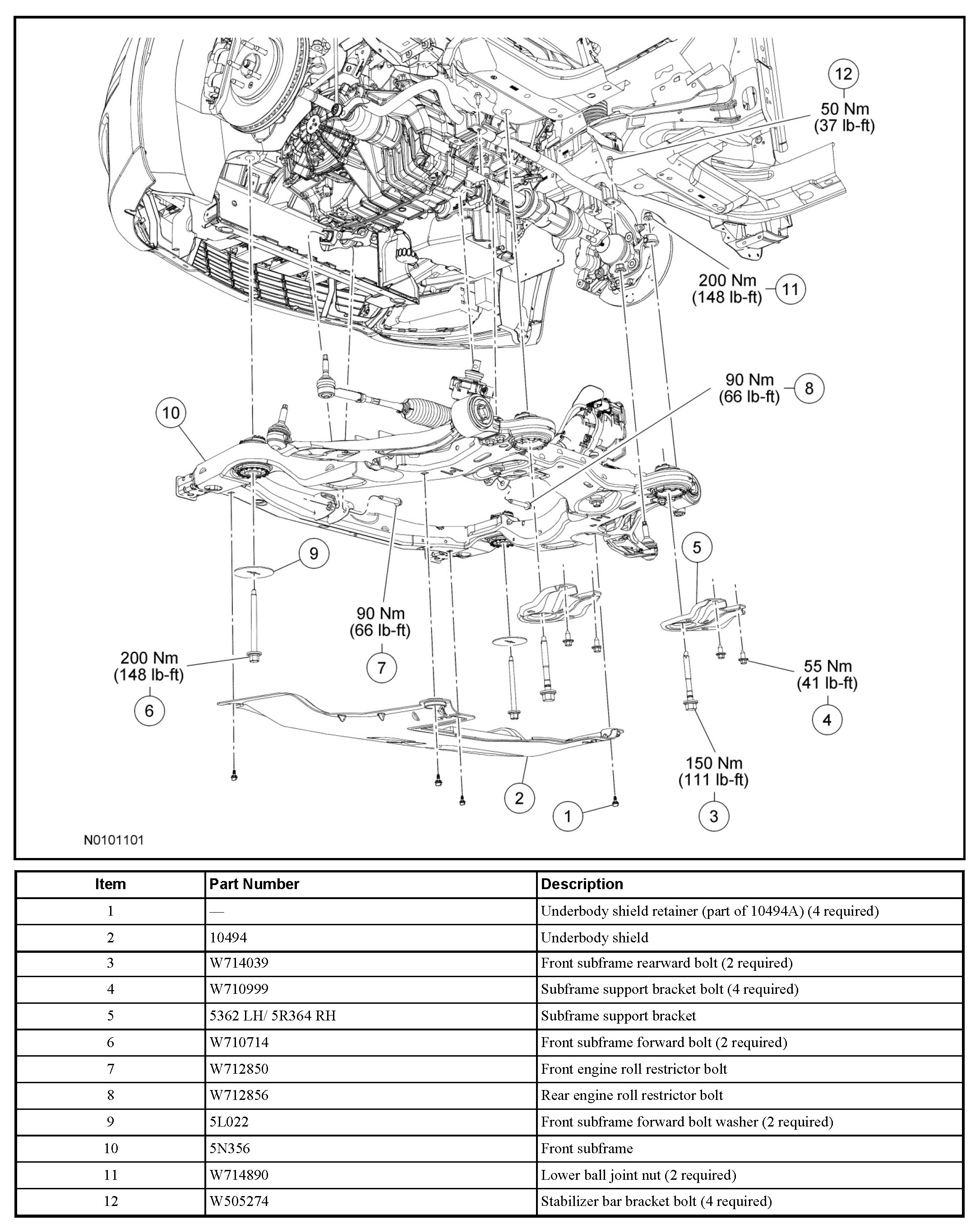 Tighten the 4 new subframe bracket-to-body bolts to 55 Nm (41 lb-ft).