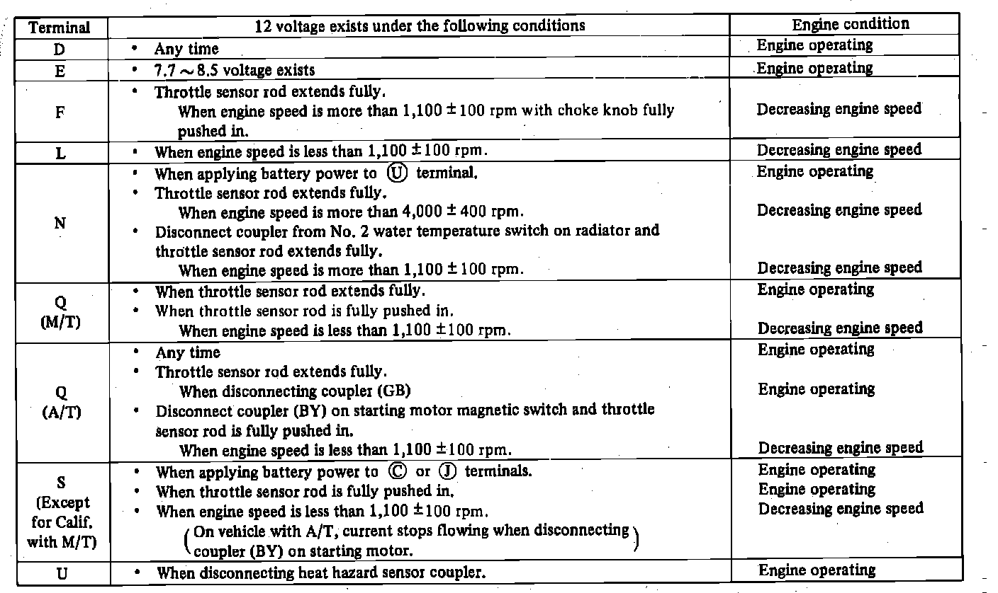 6. Connect voltmeter negative lead to (P) terminal, then with engine operating as shown in chart Fig. 23, connect positive lead to terminals indicated and check for voltage specified. If voltage is not as specified, check circuit of terminal being tested. If circuit is normal, replace engine control unit