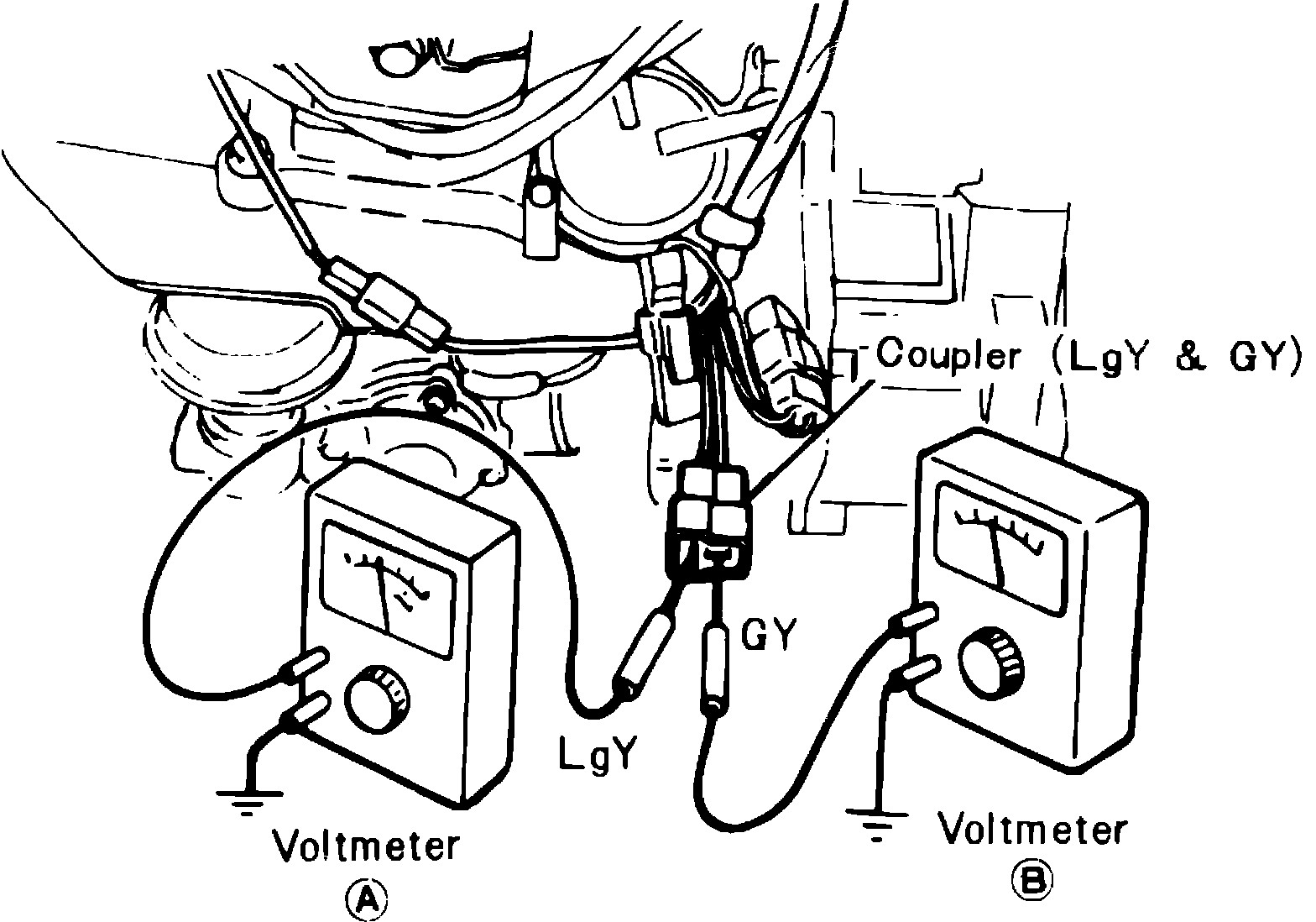Fig. 13 Connecting voltmeter to throttle sensor terminals (GY & LGY). W/carbureted engine:
