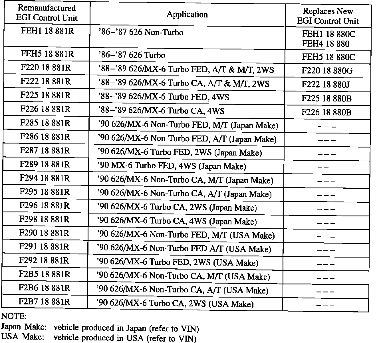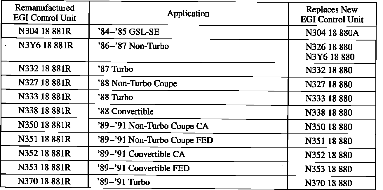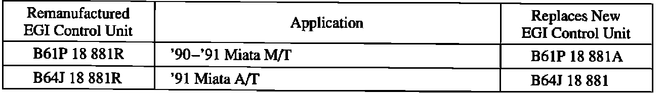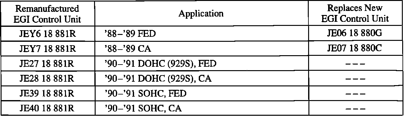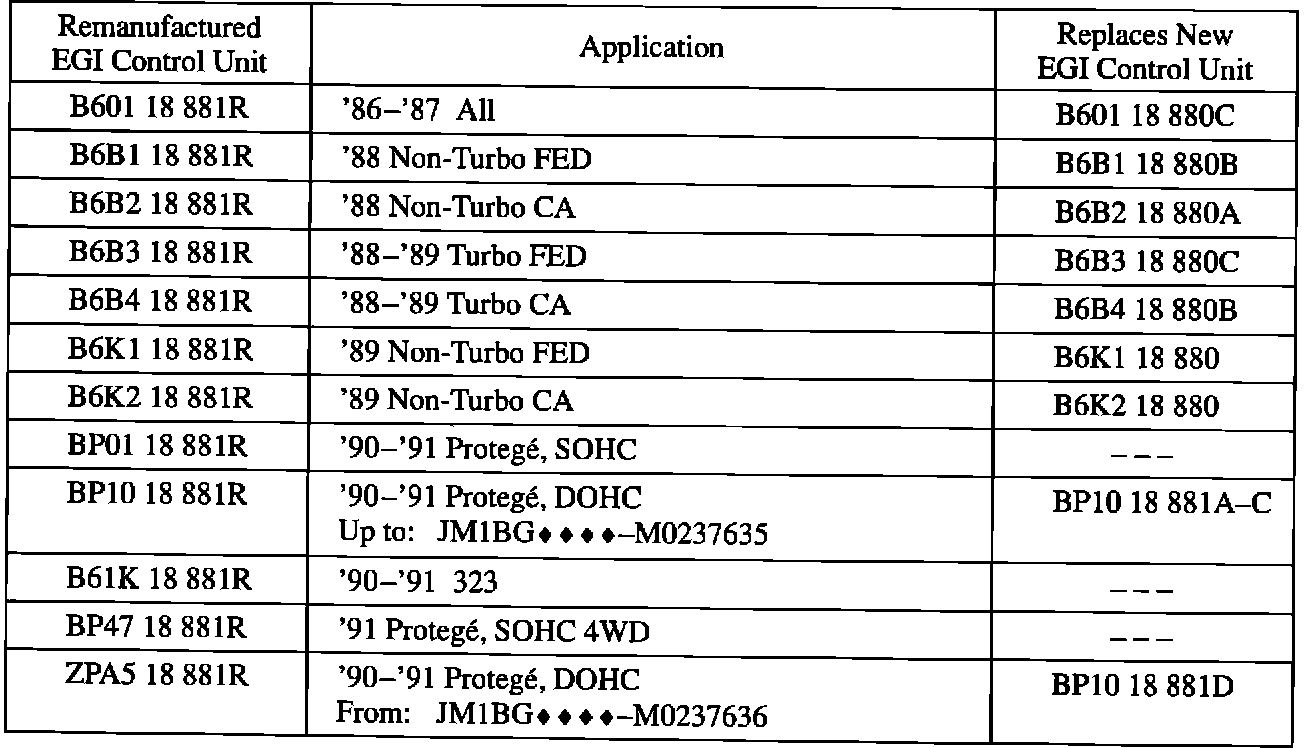 Remanufactured EGI control units for 1990 and 1991 year models have become available through the existing exchange program. The following Parts Information section shows the available remanufactured EGI control units for the following models: '86-'91 323/Protege, '86-'90 626/MX-6, '88-'91 929, '89-'91 MPV (except 2.6L), '90-'91 MX-5 and '84-'91 RX-7.