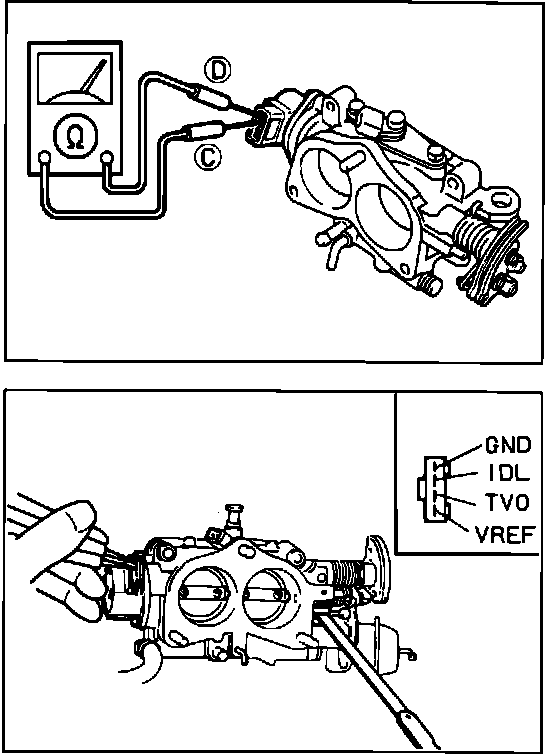 3. Connect an ohmmeter across terminals "B" and "D." Gradually open throttle and check resistance. It should be 0.2 - 0.6K ohms with throttle fully closed and 3.3 - 7.0K ohms with throttle fully open.