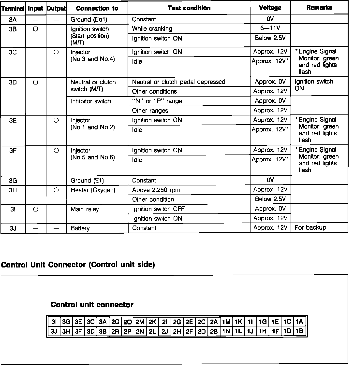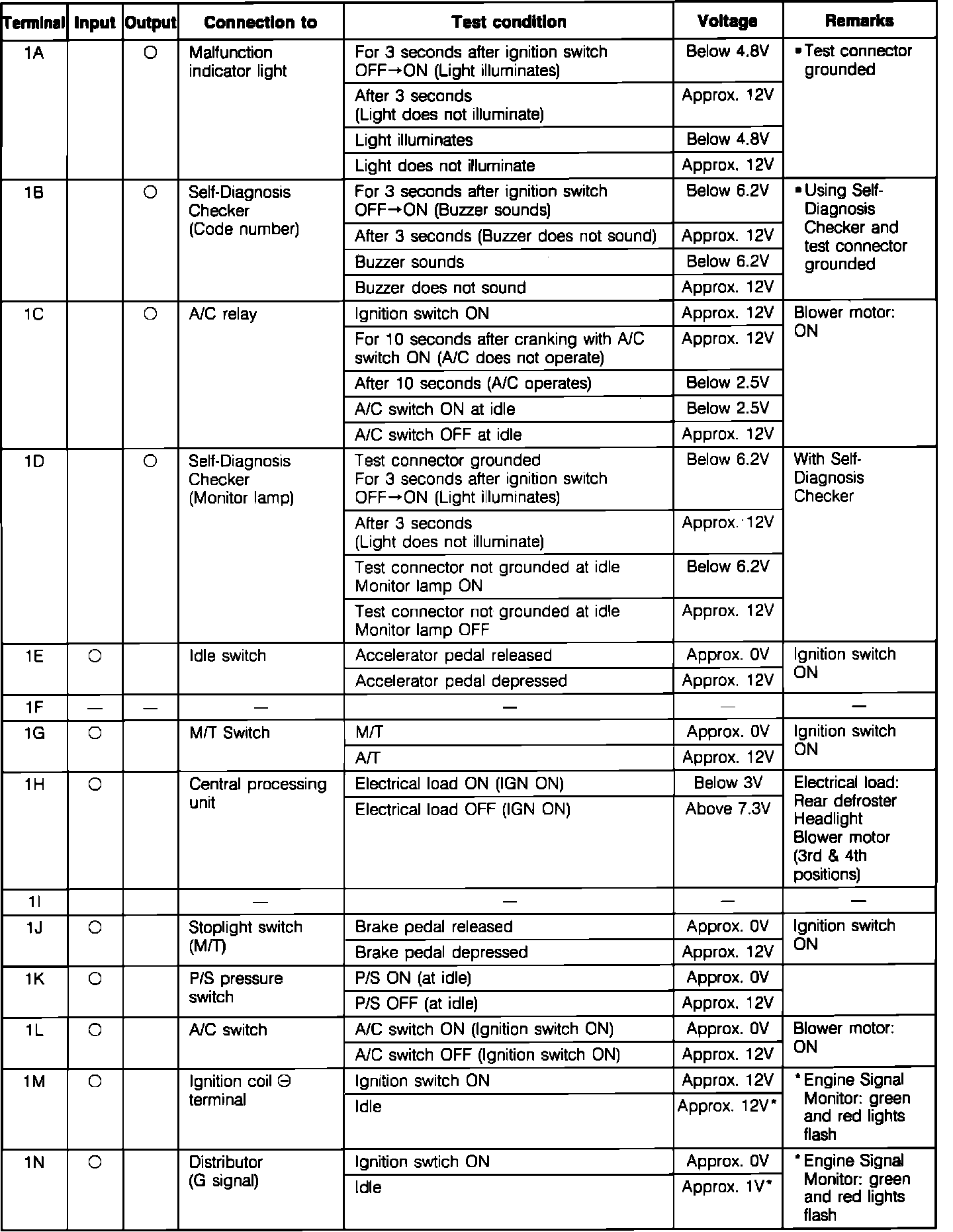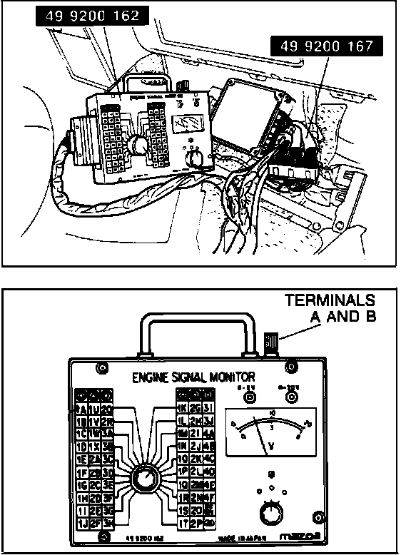 The Mazda Engine Signal Monitor (#49 9200 162) is utilized to check ECU terminal voltages. This tool inspects individual terminal voltages as selected with the monitor switch. A high impedance volt/ohm meter can also be used to check these voltages. Aftermarket test units are available that will read ECU terminal voltages when connected with proper adapters.