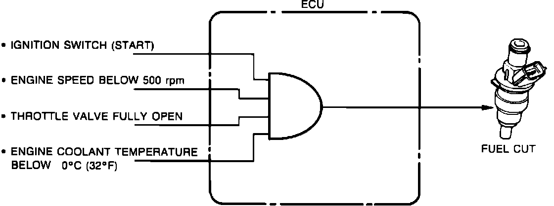 System functions to facilitate starting if the engine becomes flooded during cold weather. When specified conditions are met, the ECU prevents injectors from opening during cranking so that spark plugs can dry and excess fuel will be purged from cylinders. Fuel injection is cut when the throttle is held wide open during cranking and coolant temperature is 32°F (0°C) or below.
