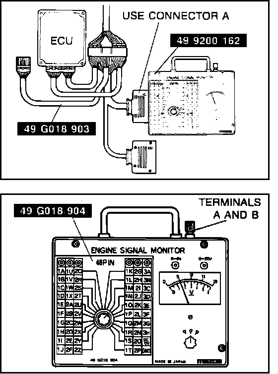 To use the Engine Signal Monitor, connect unit between ECU and wiring harness with the correct adapter (#49 G018 903). Place pin number cover sheet (#49 G018 904) on monitor face. Turn select and monitor switches to the desired terminal number for a voltage readout. Conduct tests with engine at operating temperature unless instructed otherwise.