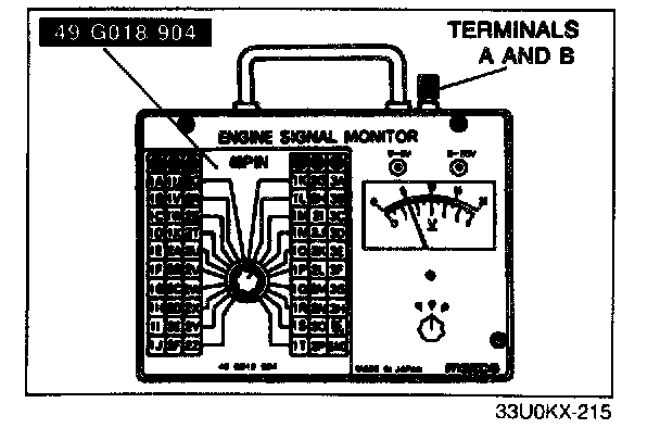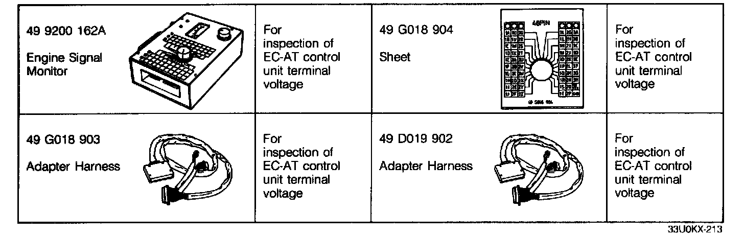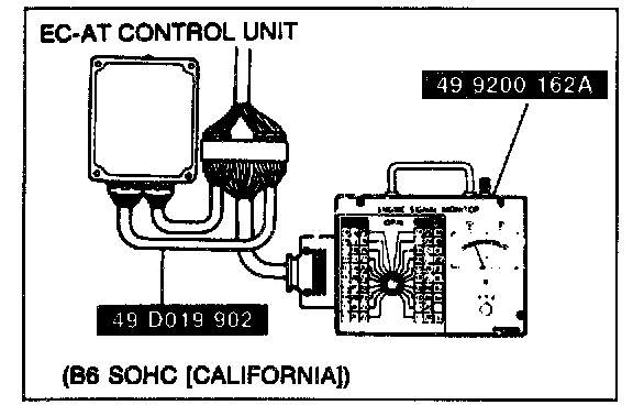 2. Connect the Engine Signal Monitor (49 9200 162A) and Adapter Harness [(49 G018 903): except B6 SOHC (California)], [(49 D019 902): B6 SOHC (California)] to the EC-AT control unit as shown.