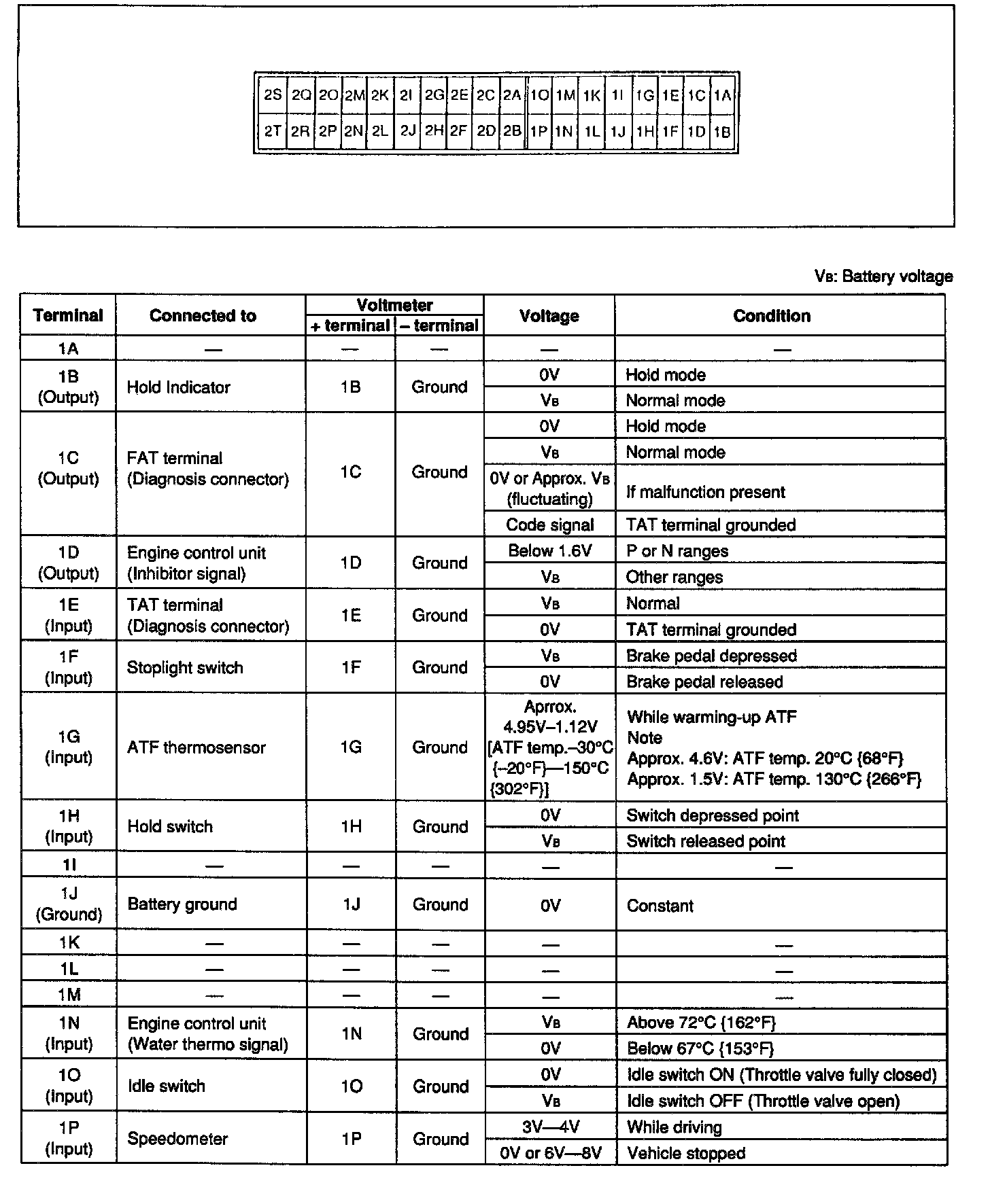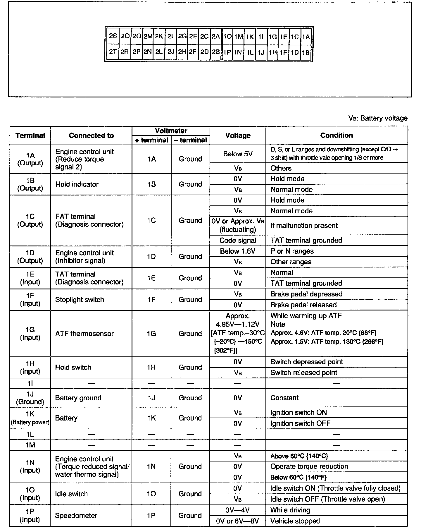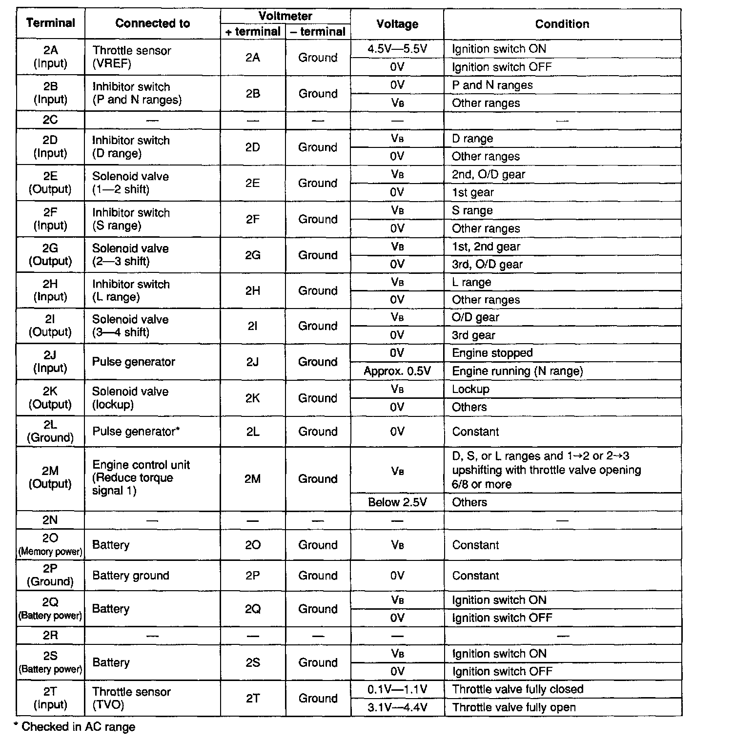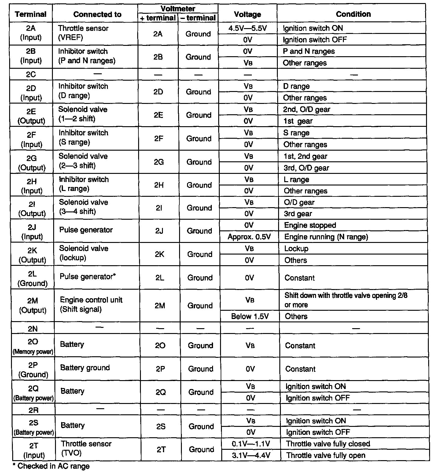 4. Turn the ignition switch ON, and check the EC-AT control unit terminal voltage, referring to the Terminal Voltage Chart.