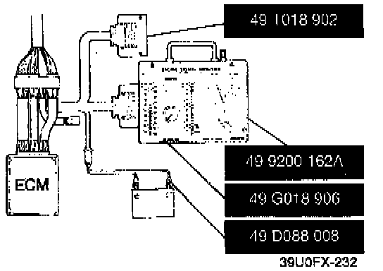 1. Connect the Special Service Tools (SSTs), (Engine Signal Monitor and Adapter Harness) to the ECM as shown.
