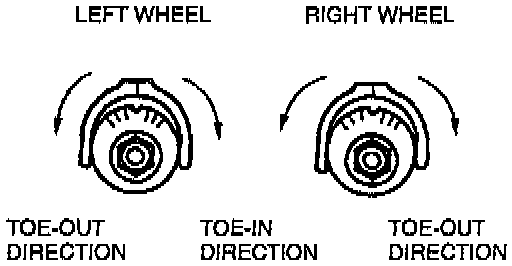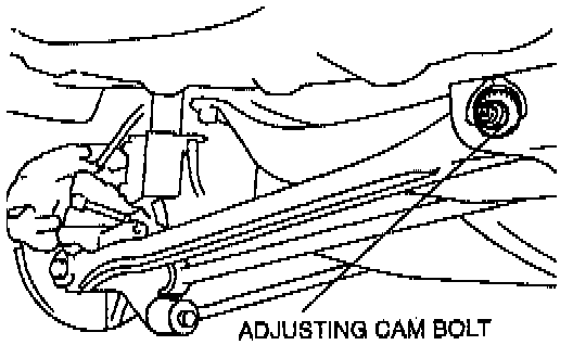 3. Turn the adjusting cam bolt as indicated to adjust the toe-in. For the left wheel toe-out is counterclockwise and toe-in is clockwise. For the right wheel toe-out is clockwise and toe-in is counterclockwise.