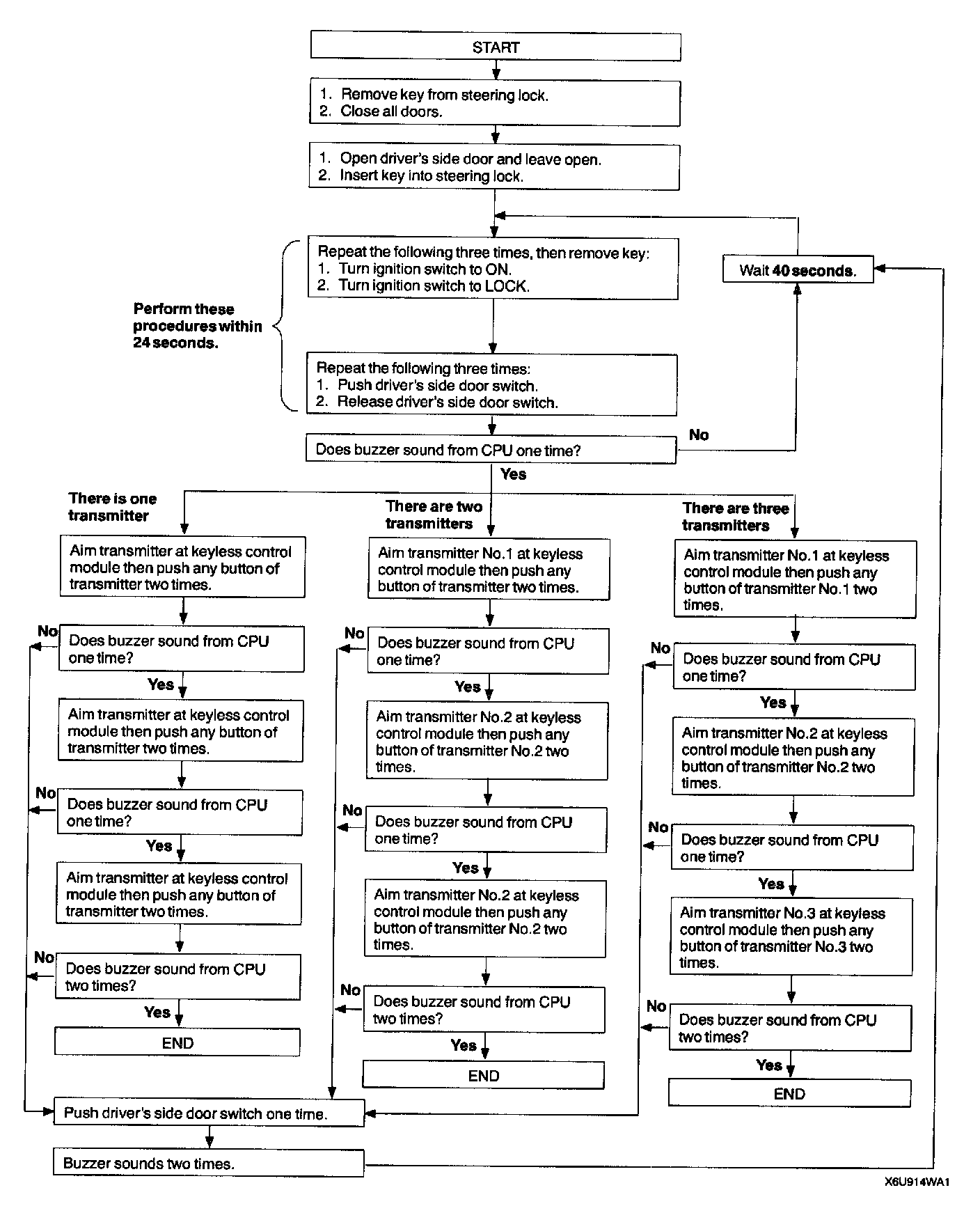 CAUTION: Because up to three ID codes can be programmed into the keyless control module, the vehicle may be stolen with the ID code of an unused transmitter. In order to prevent this, the ID codes for all three transmitters must be reprogrammed when reprogramming an ID code. Also, when one or two transmitters are used, the ID code must be programmed three times with the same transmitter.