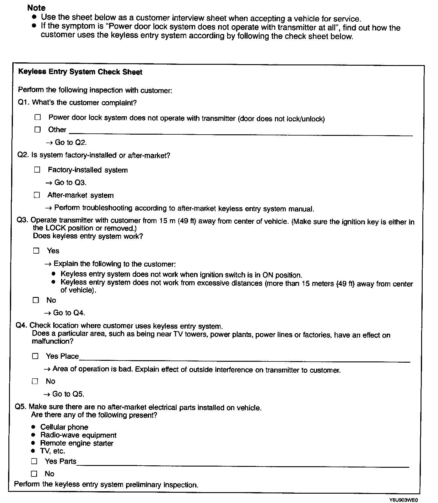 Keyless Entry System Check Sheet: