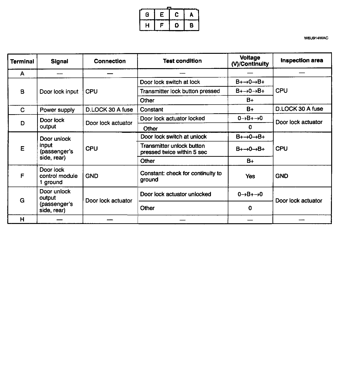 NOTE: Disconnect the door lock control module 1 connector before checking for continuity at terminal F.Terminal Voltage List (Reference):