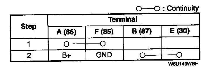 1. Remove the main relay.2. Apply battery positive voltage and check continuity between terminals of the relay by using an ohmmeter.