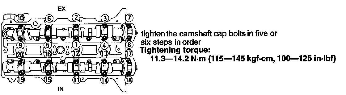 1. Tighten the cylinder head bolts in two or three steps in the order shown.