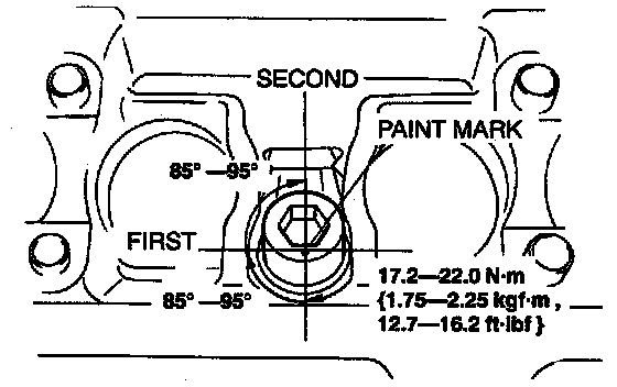 3. With the paint marks as a reference point, tighten the cylinder head bolts another 85° - 95° in the tightening order.